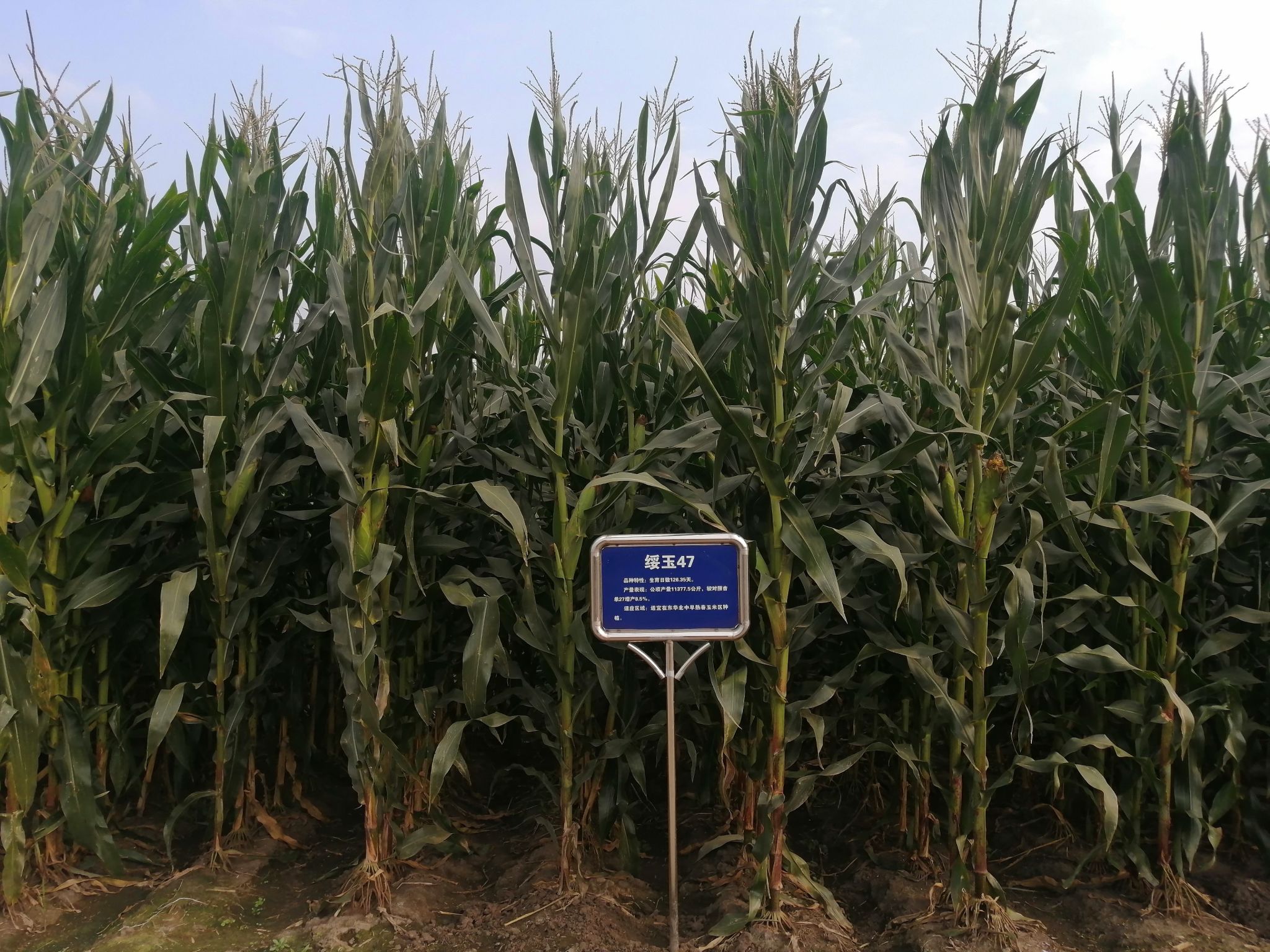 特征特性:东华北中早熟春玉米组出苗至成熟126.35天,比对照吉单27晚熟1.5天。幼苗叶鞘紫色,叶片绿色,叶缘绿色,花药黄色,颖壳绿色。株型紧凑,株高285.05厘米,穗位高120.65厘米,成株叶片数18.95片。果穗筒型,穗长19厘米,穗行数14-18行,穗粗4.85厘米,穗轴红,籽粒黄色、马齿,百粒重35.1克。接种鉴定,感/中抗大斑病,中抗/感丝黑穗病,感灰斑病,抗/中抗茎腐病,中抗/抗穗腐病,籽粒容重763克/升,粗蛋白含量8.83%,粗脂肪含量4.93%,粗淀粉含量75.03%,赖氨酸含量0.26%。