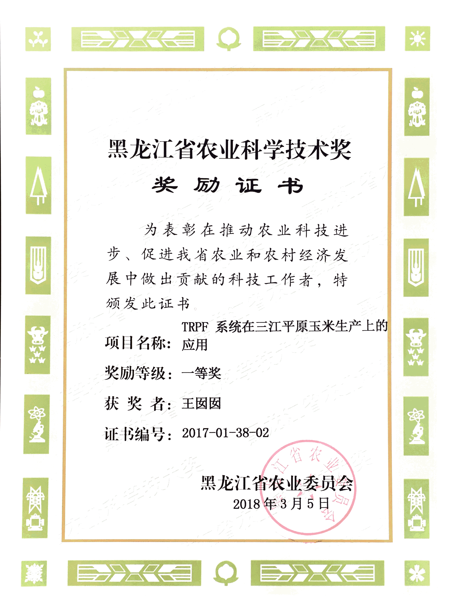 ⑤三江平原测土配方施肥TRPF系统研究与示范推广:以三江平原土壤特点及不同作物的需肥规律为基础,开发的一款实用型软件。通过合理设计养分配比,从而达到提高产投比,可有效控制化肥的投入量。