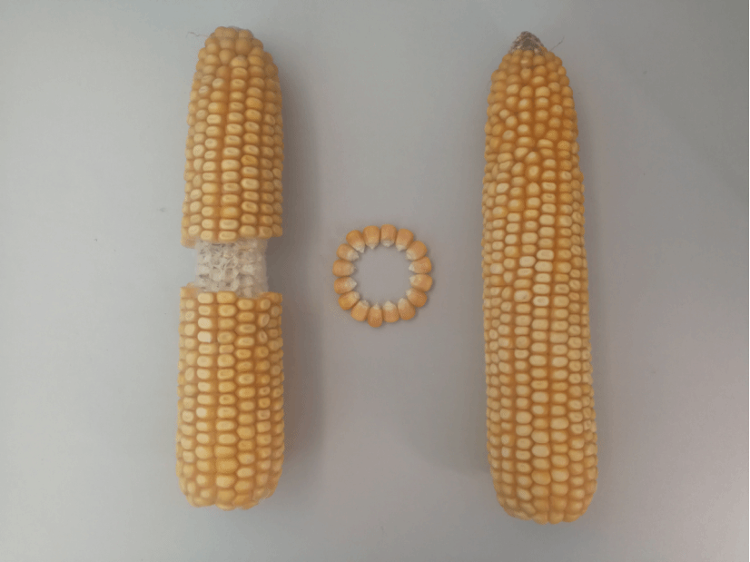 特征特性:普通玉米品种。在适应区出苗至成熟需≥10℃活动积温 2200℃左右,生育日数为113 天左右。该品种幼苗期第一叶鞘紫色,叶片绿色,茎绿色。株高 246 厘米,穗位高83 厘米,成株可见13 片叶。果穗圆柱型,穗轴白色,穗长 21.5 厘米,穗粗 4.6 厘米,穗行数16-18 行,籽粒偏硬粒型、黄色,百粒重 36.0 克。两年品质分析结果:容重765-771克/升,粗淀粉 72.70%-73.58%,粗蛋白9.97%-10.10%,粗脂肪 4.89%-5.25%。三年抗病接种鉴定结果:感大斑病,丝黑穗病:15.6%-19.3%。