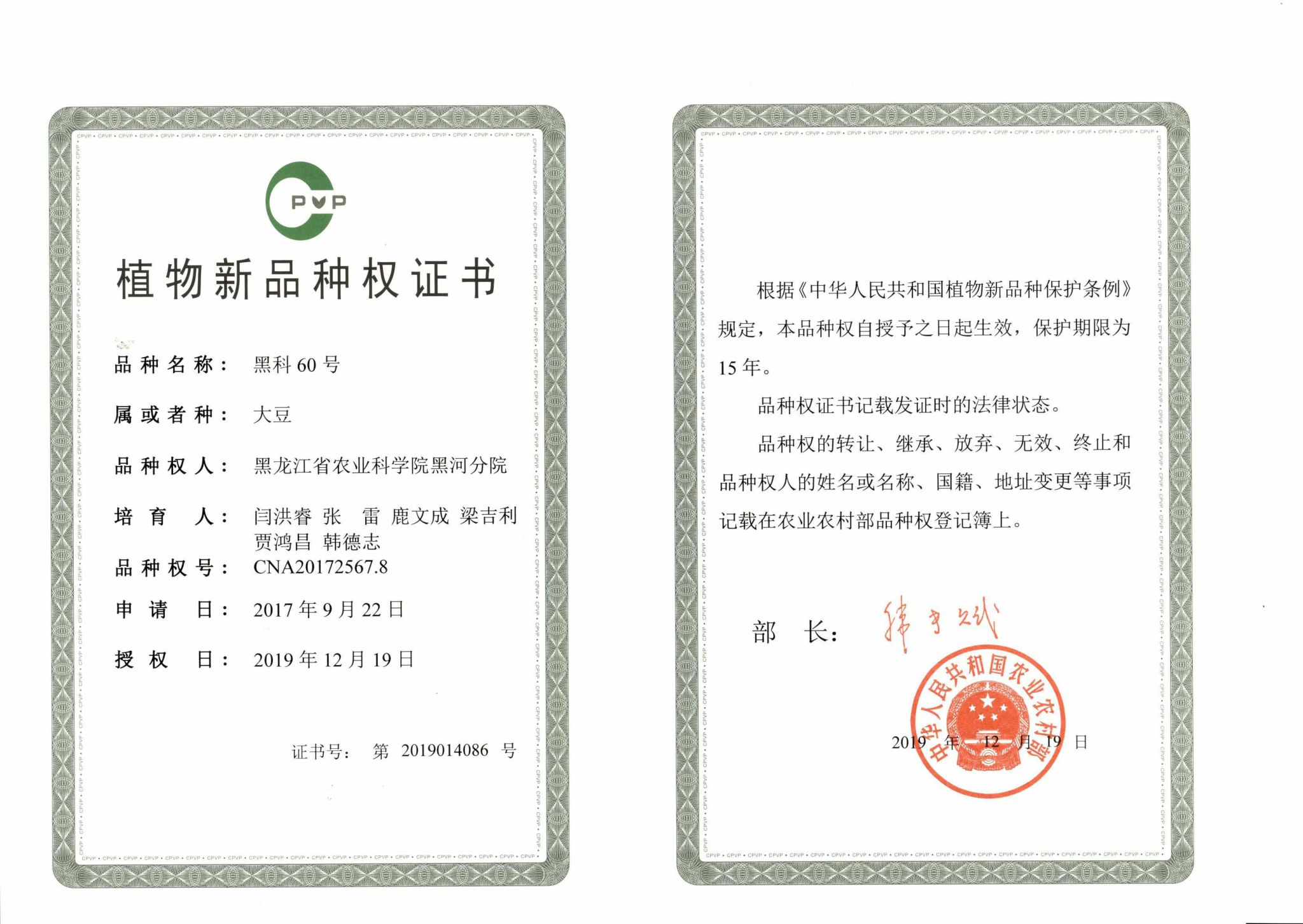 产量表现:国家:2016~2017年参加北方春大豆极早熟组品种区域试验,两年平均亩产150.3千克,比对照增产8.9%。2017年生产试验,平均亩产174.4千克,比对照黑河45号增产12.4%。黑龙江省:2015~2016年区域试验平均公顷产量2305.9公斤,较对照品种黑河43号增产11.3%;2017~2018年生产试验平均公顷产量2762.4公斤,较对照品种黑河43号增产12.8%。