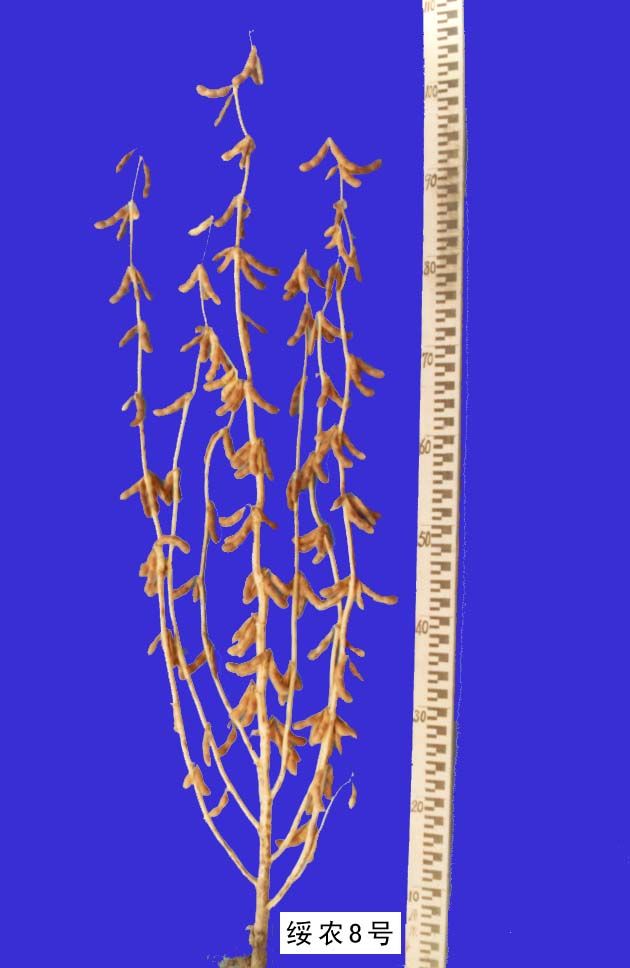 株高110cm左右,茎秆粗壮,株型呈塔形,分枝力强,结荚密,上下着荚均匀。中下部为圆叶,上部为尖叶,紫花、灰毛、无限结荚习性。荚成熟时呈褐色,不裂荚,粒圆形,种皮黄色,脐淡黄色。百粒重24克左右,蛋白质含量41.75%,脂肪含量20.32%。蚜虫危害轻,高抗灰斑病,秆强抗倒,喜肥水。生育日数117天左右,活动积温2350℃左右。
