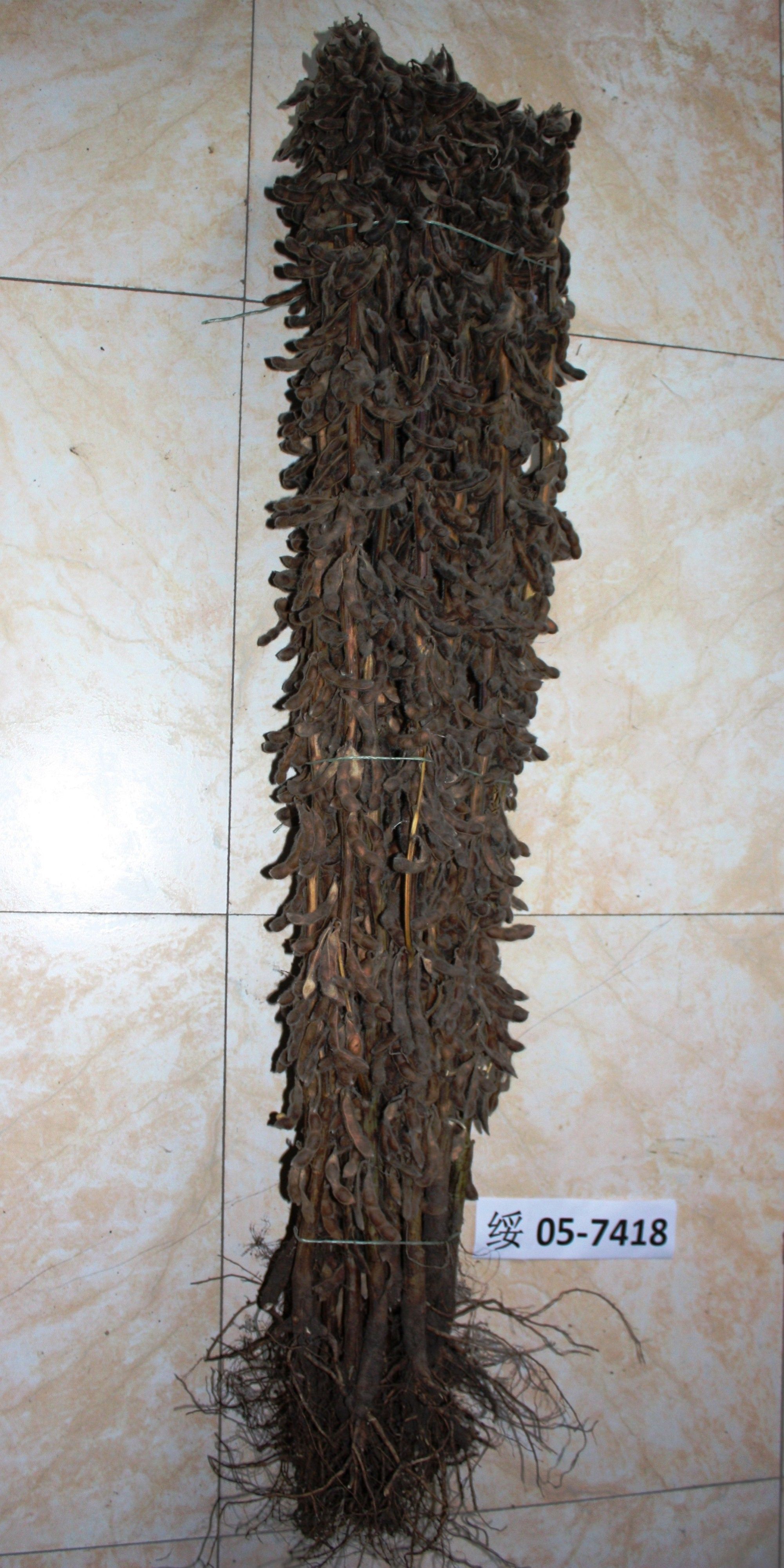 该品种为亚有限结荚习性。株高80厘米左右,无分枝,紫花,长叶,灰色茸毛,荚弯镰形,成熟时呈深褐色。子粒圆形,种皮黄色,种脐浅黄色,无光泽,百粒重20克左右。品质分析:蛋白质含量40.09%,脂肪含量20.52%。接种鉴定中抗灰斑病。在适应区,出苗至成熟生育日数118天左右,需≥10℃活动积温2400℃左右。茎秆较抗倒伏,节短节多,主茎结荚型,花多荚密,顶端帽大,三粒荚多,不炸荚。不抗蚜虫。