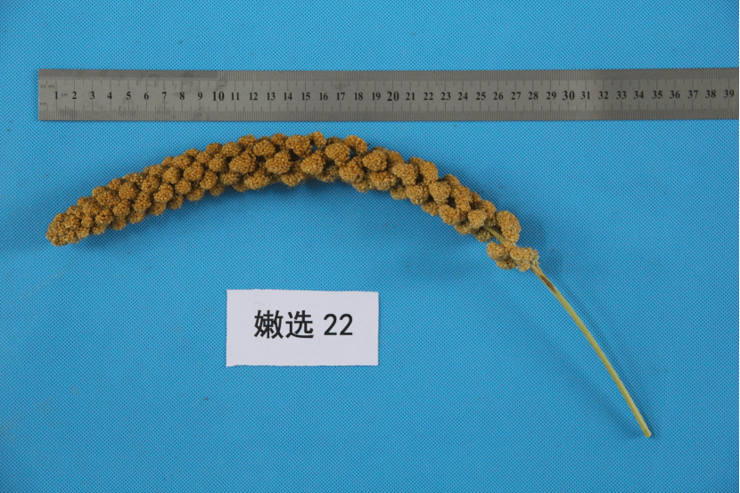 特征特性:粮用常规品种,可抗除草剂:烯禾啶。晚熟,生育期128天。幼苗叶鞘绿色,幼苗叶姿半上冲;单秆;花药白色,刚毛绿色,刚毛长度较短;平均株高121.20厘米,平均穗长19.00厘米。穗型圆锥型,穗密度密;单穗重19.22克,穗粒重15.16克;千粒重3.19克,籽粒黄色,小米中等黄色,胚乳粳型。