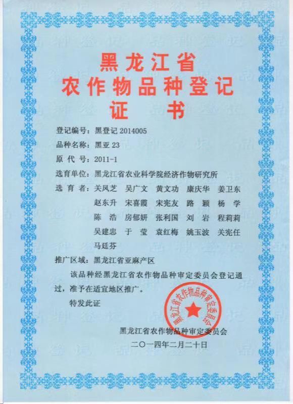特征特性:黑亚23号为高纤型亚麻品种。该品种性喜冷凉,株高85.5cm,工艺长69.0cm,苗期生长健壮,直根系,叶片深绿色,花期集中,蓝色花,种皮褐色,千粒重4.6g。抗旱、抗倒伏性强、较耐盐碱。全麻率30.9%,纤维强度253N。生育日数74天左右,需≥10℃活动积温1500℃左右。