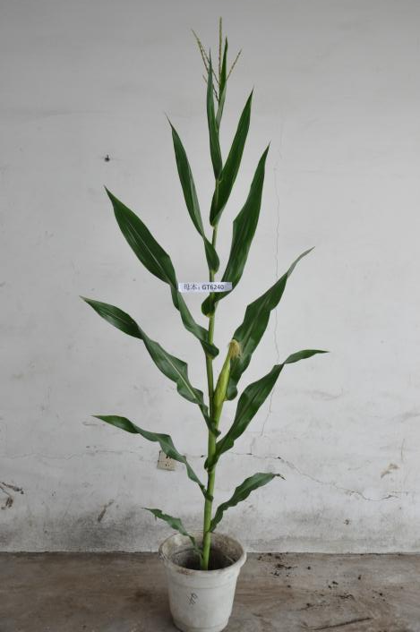 GT6240是X1132X与H261杂交,自交两代选择优良单株,经单倍体技术诱导选育出的DH系。在适应区出苗至成熟生育日数为122天左右,需≥10℃活动积温2420℃左右。该品种幼苗期第一叶鞘紫色,叶片绿色,茎绿色。雄穗一级分枝5~7个,颖壳绿色,花丝绿色,花药绿色。株高175厘米,穗位高75厘米,成株可见12片叶。果穗筒型,穗轴白色,穗长15.2厘米,穗粗4.3厘米,穗行数16~18行,籽粒偏硬粒型、粒色黄色,百粒重30.2克。