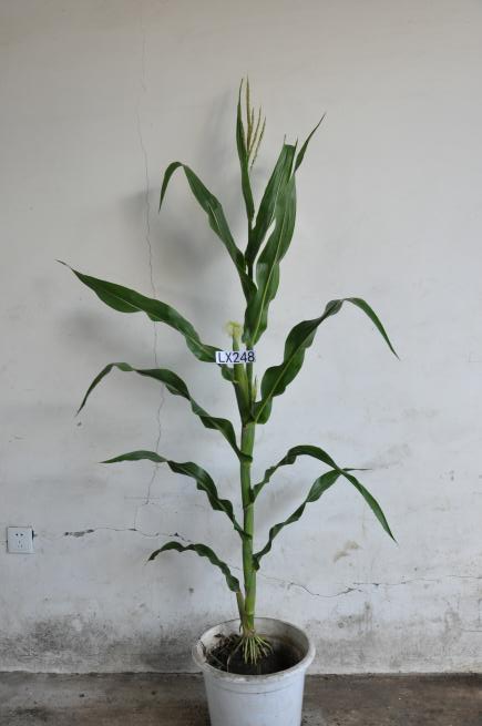 LX248是以龙早群选出的优良单株与合344为基础材料,杂交后又经多代自交配合高压筛选选育而成。在适应区出苗至成熟生育日数为118天左右,需≥10℃活动积温2320℃左右。该品种幼苗期第一叶鞘紫色,叶片绿色,茎绿色。雄穗一级分枝5~8个,颖壳绿色,花丝绿色,花药绿色。株高175厘米,穗位高83厘米,成株可见11片叶。果穗短筒型,穗轴红色,穗长14.2厘米,穗粗5.1厘米,穗行数18~20行,籽粒偏硬粒型、粒色黄色,百粒重31.8克。