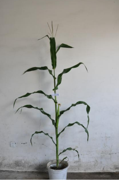 LX335是以美国解禁自交系PHVA9与龙系8为基础材料,杂交一次再用龙系8回交一次,利用单倍体技术选育而成。在适应区出苗至成熟生育日数为116天左右,需≥10℃活动积温2280℃左右。该品种幼苗期第一叶鞘紫色,叶片绿色,茎绿色。雄穗一级分枝3~5个,颖壳绿色,花丝浅紫色,花药绿色。株高185厘米,穗位高65厘米,成株可见12片叶。果穗短筒型,穗轴粉色,穗长14.5厘米,穗粗4.1厘米,穗行数12~14行,籽粒偏马齿型、粒色黄色,百粒重29.6克。