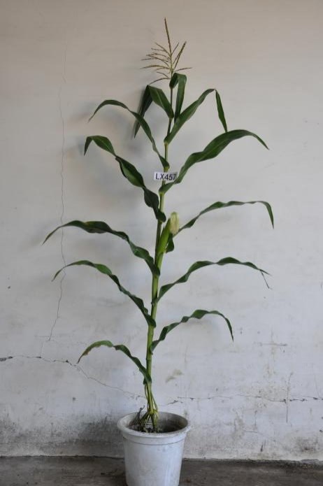LX457是以欧洲早熟系与合344为基础材料,经2代高压筛选后,利用单倍体技术选育而成。在适应区出苗至成熟生育日数为111天左右,需≥10℃活动积温2120℃左右。该品种幼苗期第一叶鞘紫色,叶片绿色,茎绿色。雄穗一级分枝12~16个,颖壳紫色,花丝绿色,花药绿色。株高182厘米,穗位高81厘米,成株可见12片叶。果穗短锥型,穗轴红色,穗长14.4厘米,穗粗4.3厘米,穗行数14~16行,籽粒硬粒型、粒色黄色,百粒重29.5克。