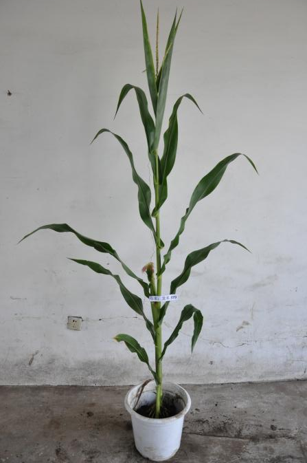 龙系379是瑞德群选出的优良单株,又经8代自交结合高压抗逆筛选选育而成的自交系。在适应区出苗至成熟生育日数为121天左右,需≥10℃活动积温2460℃左右。该品种幼苗期第一叶鞘紫色,叶片绿色,茎绿色。雄穗一级分枝3~5个,颖壳绿色,花丝浅紫色,花药绿色。株高190厘米,穗位高80厘米,成株可见14片叶。果穗筒型,穗轴红色,穗长15.0厘米,穗粗4.2厘米,穗行数14~16行,籽粒偏马齿型、粒色黄色,百粒重32.0克。