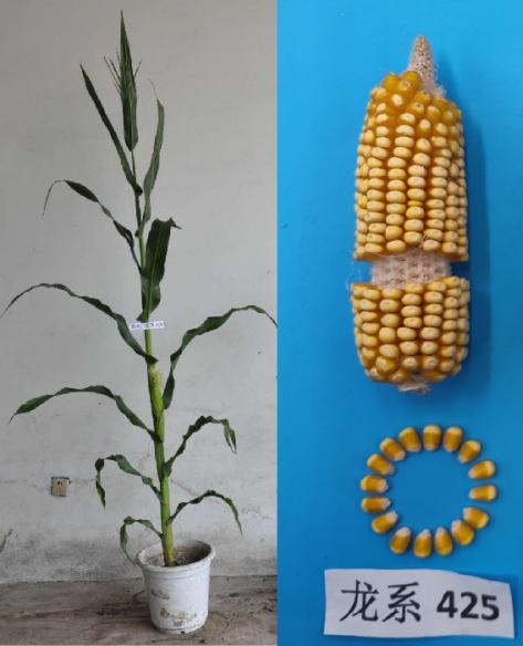 龙系425是美国杂交种与龙系373杂交,经2代高压筛选后利用单倍体技术选育而成的DH系。在哈尔滨生育日数114天左右,需活动积温2310℃左右;该品种幼苗第一叶鞘紫色,叶片绿色,茎绿色,雄穗一级分枝6~8个,颖壳浅绿色,花丝绿色,株高205厘米,穗位高75厘米,成株可见14片叶;果穗圆柱形,穗长15.5厘米,穗粗4.6厘米,穗行数14~16行,穗轴白色,籽粒中齿类型,百粒重28.4克左右。