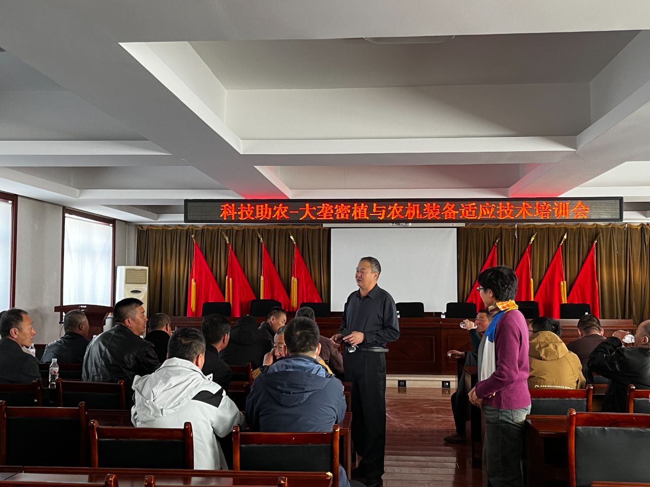 3月22日,省农机院齐齐哈尔分院副院长曹明璐带队赴甘南县中兴乡,开展“惠农科技培训班”,为当地农业技术骨干、种植大户等50余人讲解粮食作物大垄密植机械化高产种植技术。