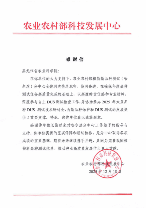 近日,农业农村部科技发展中心向成人网站 发来感谢信,对承建的农业农村部植物新品种测试(哈尔滨)分中心在新品种保护和DUS测试的发展提供的重要支撑,给予高度肯定和诚挚感谢。