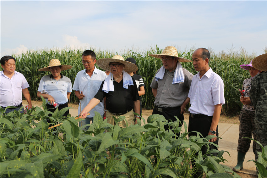 当天下午,盖钧镒院士一行还到分院大豆试验田进行了田间考察。82岁高龄的盖院士,顶着烈日认真查看了试验田不同处理大豆的田间表现,并听取了牡丹江分院院长助理任海洋和试验站科研人员对大豆育种等试验的介绍。盖院士不时就育种材料选择、主要特性等进行了仔细询问,与科研人员一同对育种材料进行分析,他对大豆育种试验实施情况表示肯定,并对大豆试验后期管理要点及注意事项给予了指导性意见。