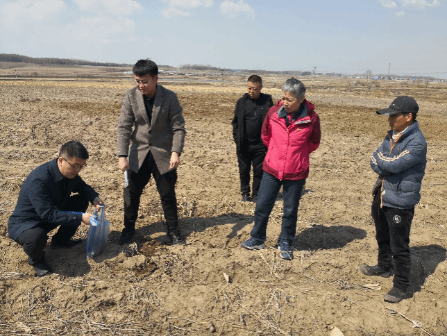 4月19日栽培所水稻专家王麒、丁国华,玉米专家钱春荣、张艺腾深入延寿县安山乡、加信镇种田大户的田间地头开展对接和服务工作。上午在延寿县农艺技术推广中心张剑秋副主任和龚春来副主任带领下来到安山乡富星村种粮大户杜怀宇种植的大豆和玉米田,针对土壤酸化问题探讨解决方法,玉米专家钱春荣副所长在了解农户施肥习惯和产量基础上,初步提出了施用生物有机肥、生石灰等解决措施,在不同田块采取了土壤样品,跟踪监测土壤质量状况,有针对性制定解决方案,助力大豆和玉米产量提升,并起到示范引领作用。