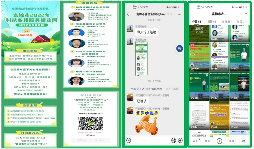 一是云上课堂新形式,直播讲解进万家。3月28日至4月1日,利用快手公众号进行技术培训指导,累计浏览1.8万人次。成人网站 丁俊杰、孙芳、王喜庆、刘玉峰等12名知名专家,针对农业政策、畜牧养殖技术、农机农艺技术、社会化服务、保险和中央一号文件等内容开展线上培训,提升科技服务的针对性、趣味性、参与度及辐射面,尤其针对科技热点问题和2022年中央一号文件,进行通俗化讲解,为促进今年的农业生产奠定基础。直播期间学员们的热情高涨、互动频繁、线上科技周深受好评,通过专家和主持人同屏,学员和专家连麦的模式,很多疑问都一一得到回应,通过回放功能,学员们还可以随时对没掌握好的知识后期收看回放。同时,富锦市农技推广人员也利用农业技术热线、微信群等方式,对全市种植大户、合作社、家庭农场进行“一对一”的精确指导,双方协作分工明确,网格化服务初见模型。