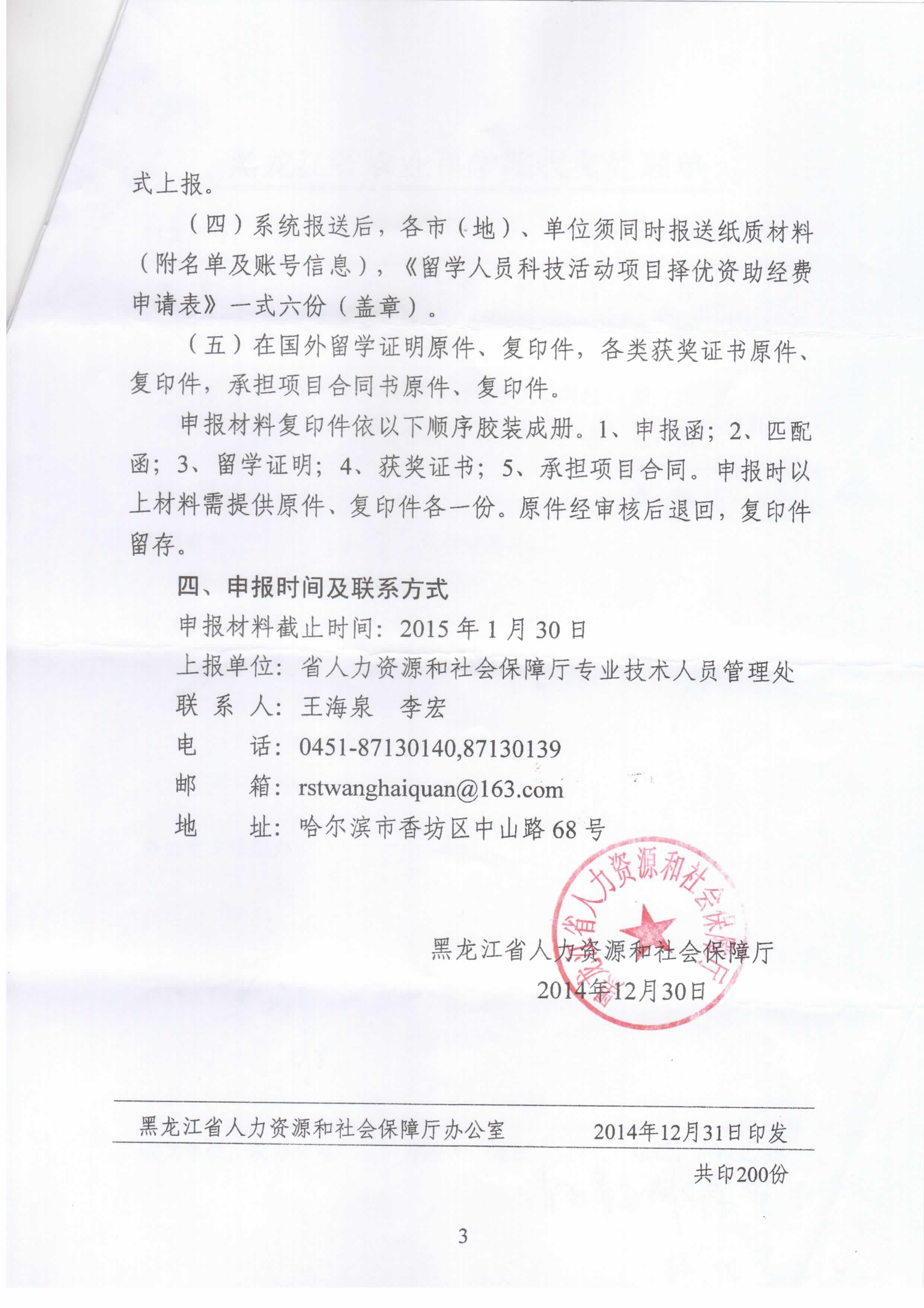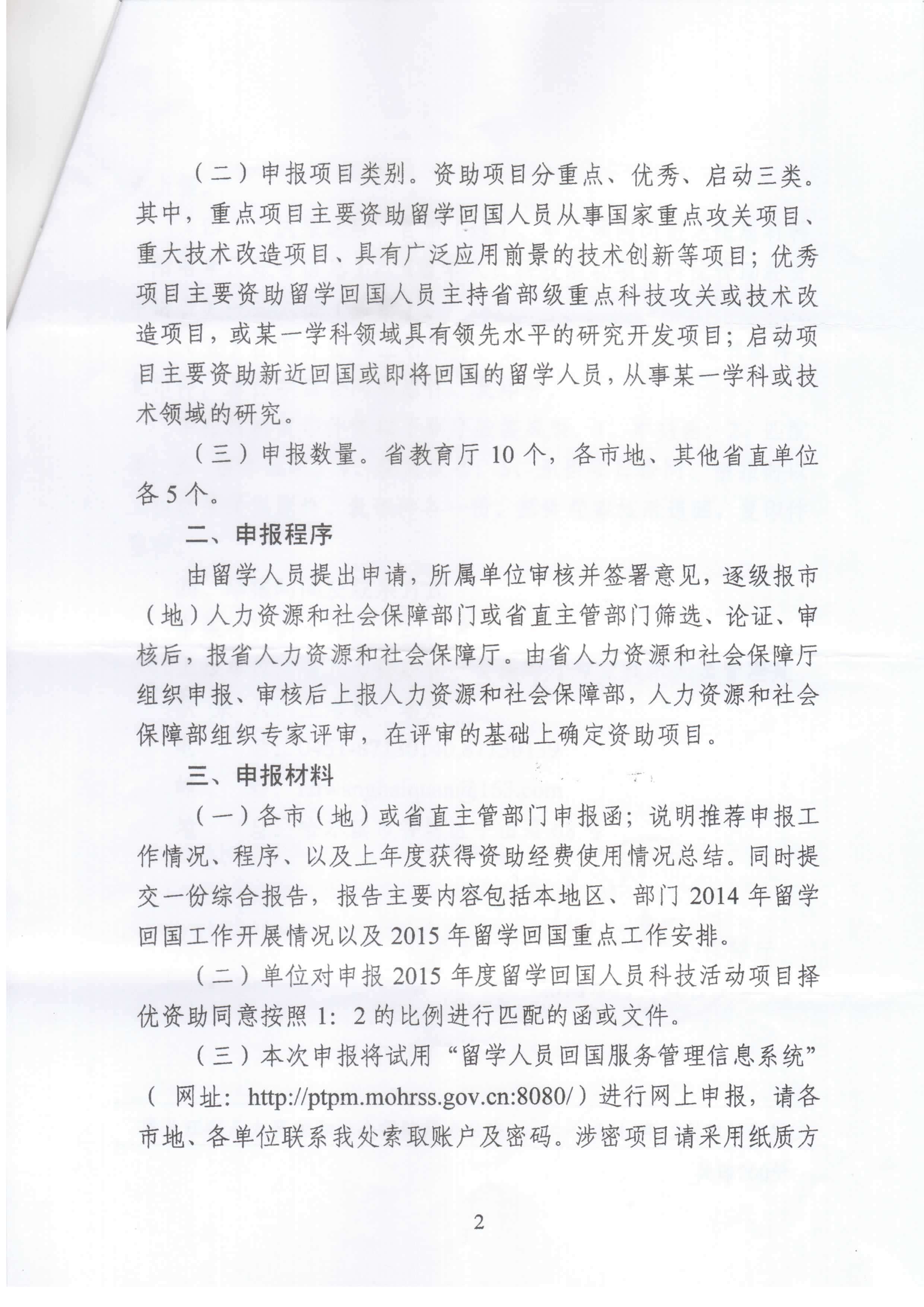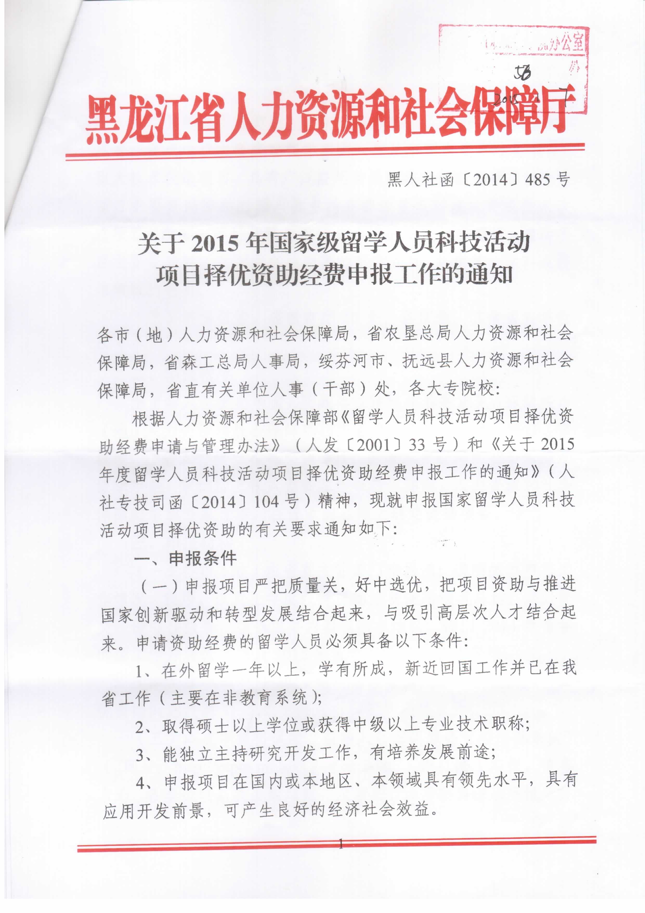 现将《关于2015年国家级留学人员科技活动项目择优资助经费申报工作的通知》(黑人社函〔2014〕485号)转发给各单位,请按文件要求做好本单位留学人员科技活动项目择优资助申报工作。