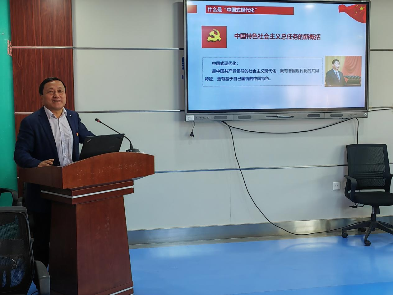 来永才副院长以《习近平新时代中国特色社会主义思想主题教育--以中国式现代化全面推进中华民族伟大复兴》为题进行了党课辅导。他从“三个统一”“三个务必”和“两个任务”等主题教育的意义入手,以理论和实践相结合的方式,围绕什么是“中国式现代化”、“中国式现代化”新在何处、“中国式现代化”的本质要求、“中国式现代化”总的战略安排以及关于“中国式现代化”思考进行了深入浅出的辅导与分享。来永才副院长强调,党的二十大提出的关于“三农”工作的重要论述,为我们农业科研单位的发展指明了前进方向、提供了重要遵循,遥信所全体职工要从“中国式现代化”中学会发散思维,对于“中国式现代化”和“非中国式现代化”“西方式现代化”的区别进行认真思考、深入理解,将“中国式现代化”的精神内涵和理论实质融入到农业信息化科技创新中,为黑龙江省农业大发展、快发展做出贡献。