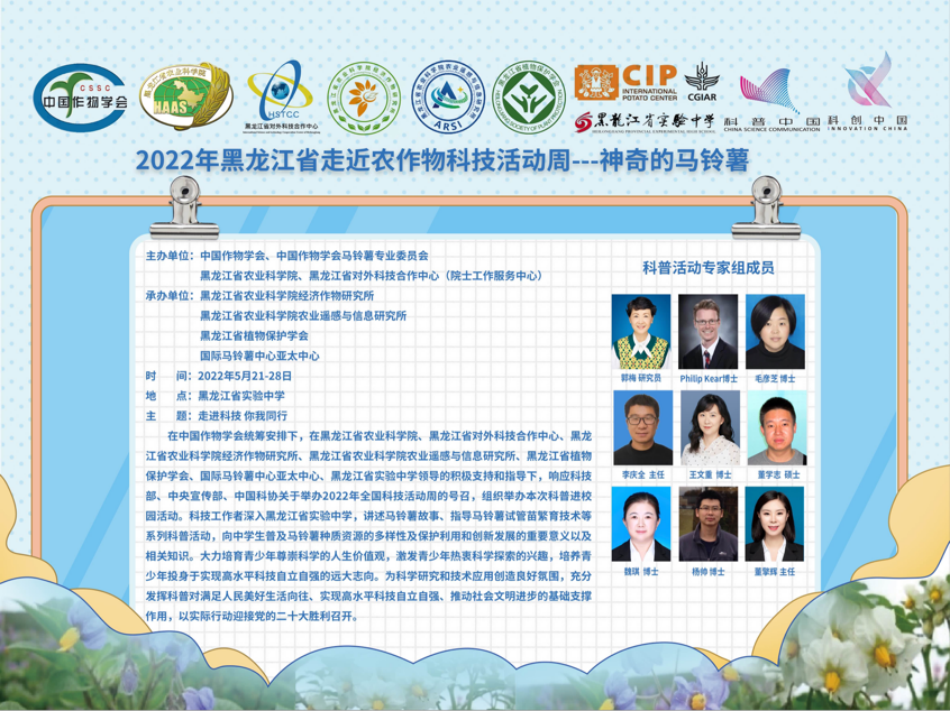 作为活动的重要组成部分,在中国作物学会统筹安排下,在成人网站 ,黑龙江省对外科技合作中心,成人网站 经济作物研究所、农业遥感与信息研究所、黑龙江省植物保护学会、国际马铃薯中心亚太中心、黑龙江省试验中学领导的积极支持和指导下,以“走进科技 你我同行”为主题,通过“线上+线下”方式,开展了科普进校园系列活动。活动旨在激发青少年热衷科学探索的兴趣,培养青少年投身于实现高水平科技自立自强的远大志向。