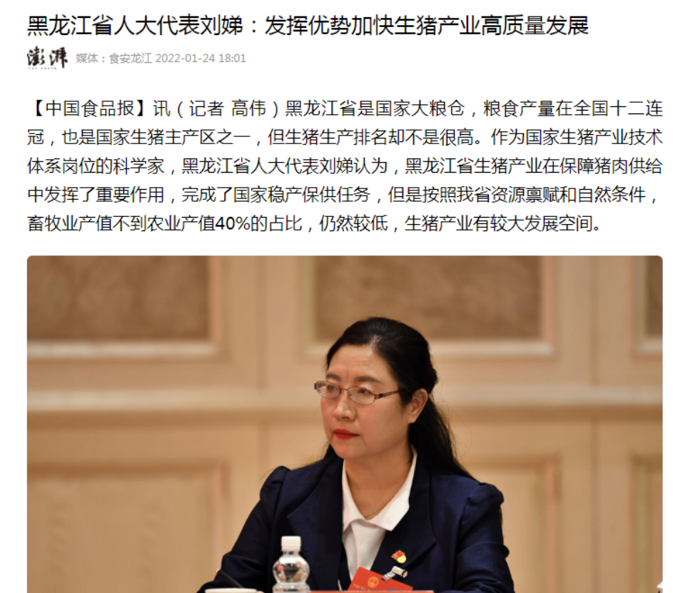同时,作为国家生猪产业技术体系岗位科学家、省生猪产业技术协同创新体系首席科学家,刘娣代表也一直关注着黑龙江省生猪产业发展,在她看来,《政府工作报告》中提到的“让中国饭碗装上更多优质的龙江粮”中的“粮”,不仅仅指粮食,更应是黑龙江省所有的农产品和有机绿色食品,其中也包括优质黑猪肉,也就是细嫩鲜香的东北民猪肉。“这次会议上,我还提出了2个关于提升我省民猪产能、加快生猪产业高质量发展的建议”,刘娣表示,“相信黑龙江绿色好吃的‘大米饭+红烧肉’,会端上全国更多百姓的餐桌”。