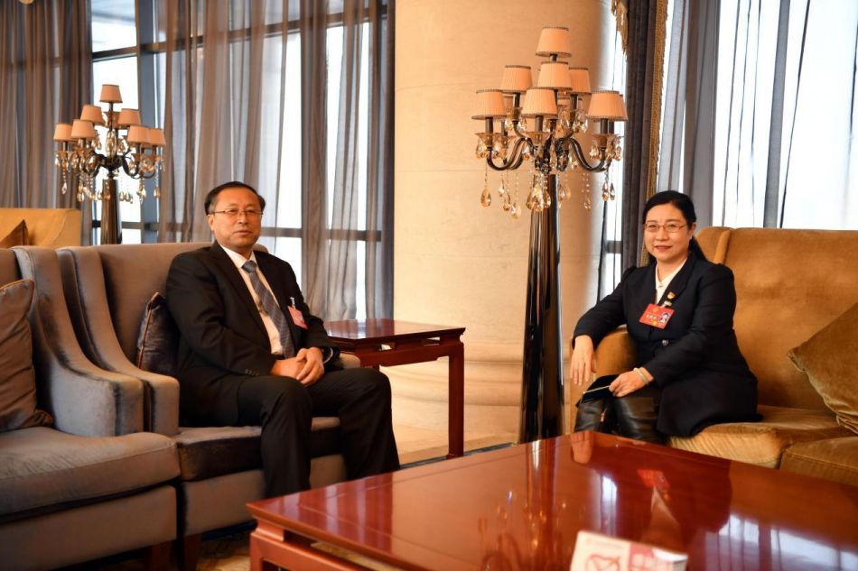 图为刘娣代表和潘国君代表在《黑龙江日报》采访区接受采访(摄影:龙头新闻 宋淼)