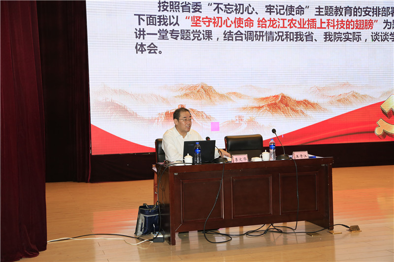 8月8日,成人网站 举行“不忘初心 牢记使命”主题教育专题党课,党组书记刘娣、院长李文华分别在学术报告厅和专家公寓作了题为《守初心科技兴农 担使命稳粮强院》、《坚守初心使命 给龙江农业插上科技的翅膀》主题教育专题党课报告,院领导班子成员、全院副处级以上领导干部及哈内各党委(支部)全体党员参会,哈外各分院(研究所)科级以下党员通过视频会议系统收看了会议转播。