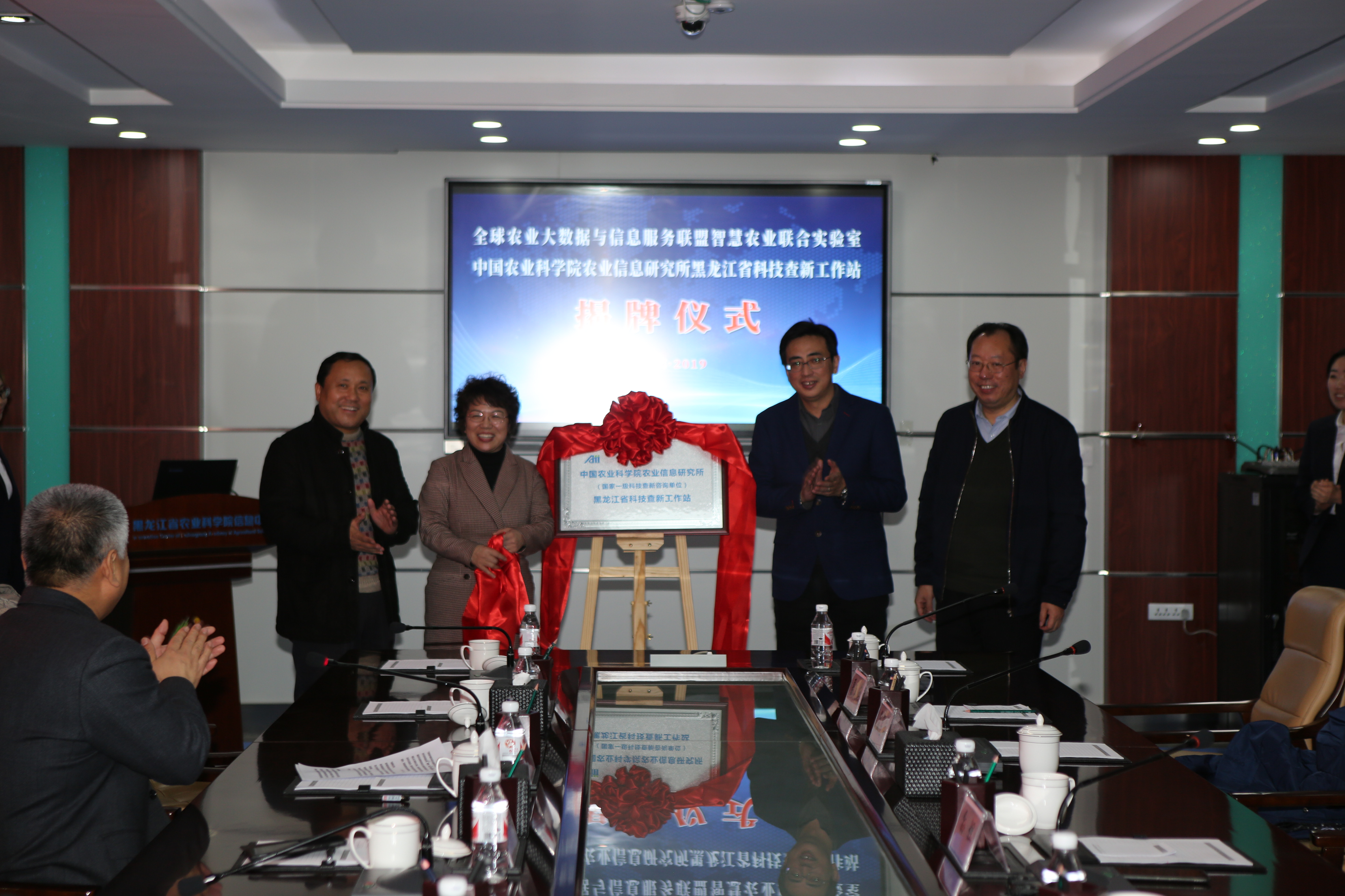 随后,孙坦所长、庄严副处长、周国民副所长、来永才副院长、毕洪文主任先后为智慧农业联合实验室和黑龙江查新工作站揭牌。