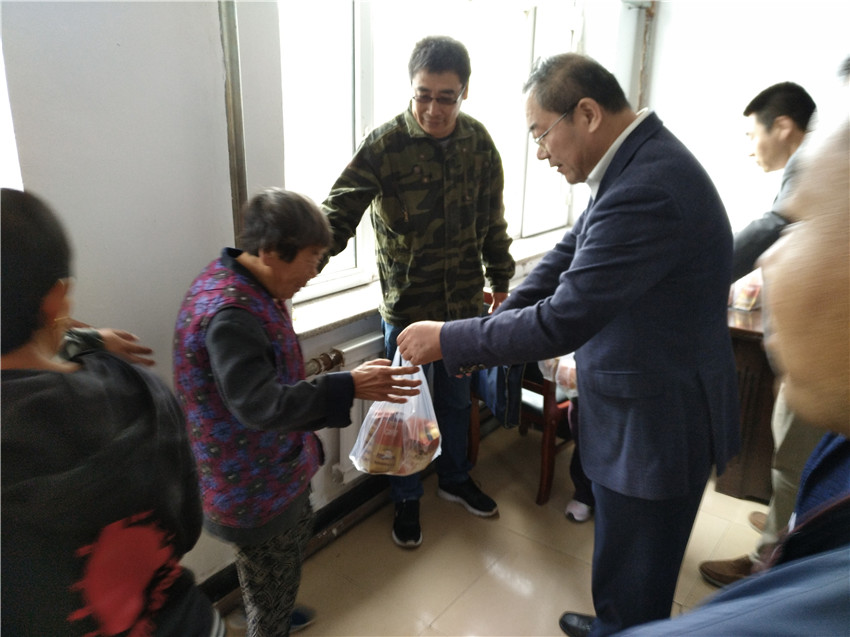 9月26日,成人网站 院长李文华、总农艺师闫文义率科技推广处处长马冬君、农产品质检中心主任廖辉、脱毒苗木研究所所长吕典秋、食品加工研究所副所长谢学军等一行到兰西县远大镇胜利村慰问贫困户和五保户,为87户建档立卡贫困户和28户五保户带来中秋月饼,并看望成人网站 驻胜利村工作队队员。