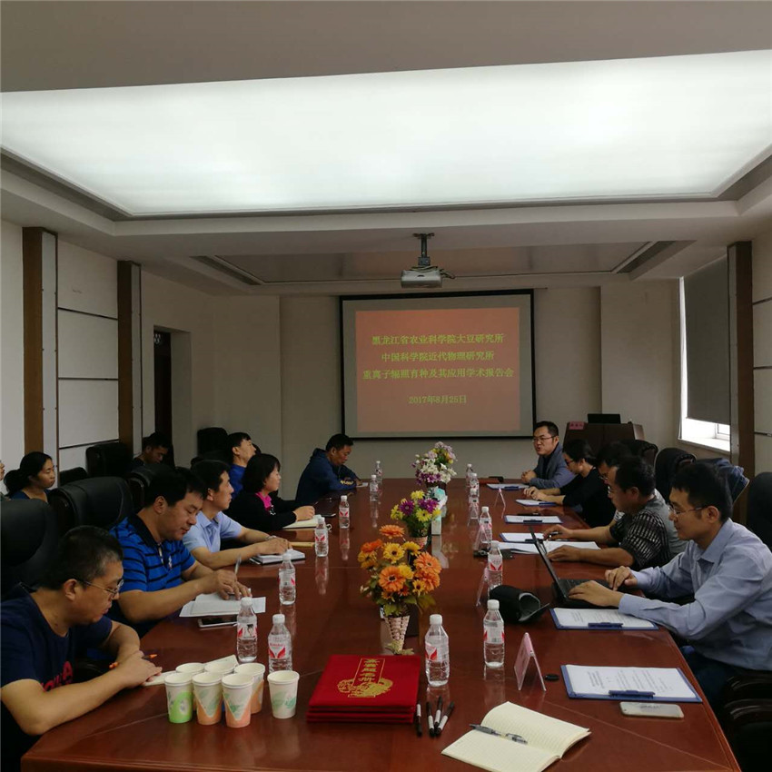 在交流会上,大豆研究所所长王广金研究员详细介绍了大豆所开展的大豆诱变育种研究情况。李文建研究员介绍了中国科学院近代物理研究所的科研现状,并以《重离子辐照育种及其应用》为题做了学术报告。与会科研人员就报告进行了热烈讨论,并初步达成科研合作意向,拟在重离子辐照大豆科研工作中开展合作,进一步创新大豆资源。