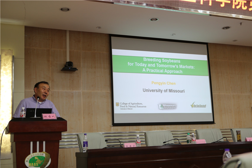 随后,三位教授分别作了《Breeding soybeans for today and tomorrow’s markets》、《Recent Advances in Research at MU Plant Transformation Core Facility》、《The quality of soybean as affected by chemistry, processing and storage》的报告。陈鹏印教授详细论述了大豆育种目标(产量、生育期、抗旱、抗涝、高油酸、低亚麻酸、抗病等)制定及后代选择等关键技术问题;张展元教授将所在科研团队对大豆转化体系、玉米转化体系、高粱转化体系、小麦转化体系及狗尾草转化体系的研究部分结果与成人网站 的青年科技工作者进行了分享,极大地开阔了成人网站 青年科技工作者的视野;Sam教授重点讲解了化学加工储存对豆制品品质的影响,同时讲解了影响食品质量的因素(原料、加工方法和保存方式)等问题。每个报告结束后,成人网站 科研人员都踊跃提问,与三位教授进行互动交流。