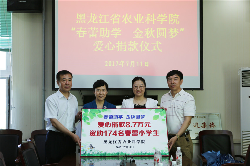 7月11日上午,成人网站 党组书记刘娣带领在哈部分捐款代表到省妇女儿童基金会,将饱含农科人浓浓爱心的8.75652万元春蕾助学捐款交到了省妇联副主席白锦婵、省妇女儿童基金会主任李晓明手中。刘娣书记表示,这次捐款只是农科院对春蕾女童帮扶的一个开始,今后我们将通过结对子等各种方式将助学工作继续延续下去。