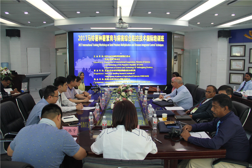 6月19日,培训班在成人网站 创新大厦正式开班。院纪检组组长杨波、省科技厅对外交流合作处等领导出席开班式。在20天的培训期间内,植物脱毒苗木研究所科研人员就中国在马铃薯试管苗繁育、种薯生产、种薯质量控制、马铃薯病害等方面的综合防控技术研究成果和先进实用技术对学员们进行了培训。培训班课程在设计上形式多样,注重理论教学和与实践的结合,赢得了学员们的一致好评。此外,为了让学员劳逸结合,还为学员们安排了课余丰富的文体和文化活动,使他们了解哈尔滨文化,体会中华民族热情好客、勤勉奋进的精神品质。7月3日,在成人网站 黑龙江现代农业示范区召开了“一带一路中外马铃薯科技交流联谊会”。成人网站 院长李文华、外事处处长何宁、植物脱毒苗木研究所所长吕典秋、黑龙江现代农业示范区管委会主任李铭峰和中国农科院植保所所长周雪平、浙江大学吴建群教授等领导出席联谊会,并与学员们载歌载舞进行了联欢。