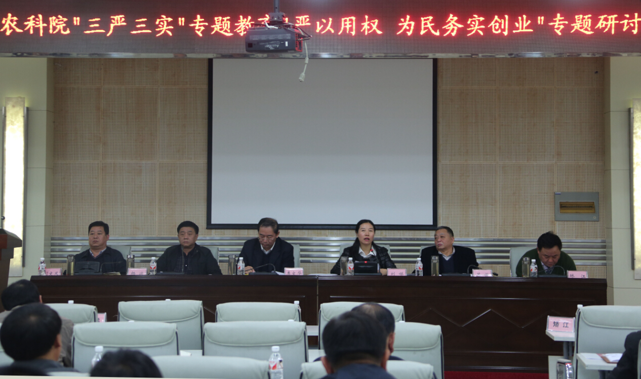 “严以用权 为民务实创业”专题研讨会上,院党组书记刘娣和院长李文华带头、6位院领导以“严以用权 为民务实创业”为主题,结合各自分管的实际工作每人作了10分钟的发言,4位副处级以上领导干部结合主题和院领导的发言进行了每人5分钟左右的讨论发言。刘娣书记在发言中强调,要践行“三严三实”就要了解“三严三实”的重要意义,要从严从实地推进成人网站 “三严三实”专题教育活动,她讲到权力是一把“双刃剑”,正确运用就是一把为群众所称道的金刚之剑,错误使用以权谋私,就是一把为群众所不齿的万恶之剑。刘娣表示,作为党组书记自己要率先垂范,将权力行使在阳光之下,接受全院群众的监督。她用两句既简单又朴实的话语勉励大家,她说“全心全意听党话, 鞠躬尽瘁能干活”,鼓励大家成为一名真正的“三严三实”的好干部。李文华院长在研讨会上讲到,对于党员领导干部来说最关键的就是“严以用权”,全院领导干部一定要将权力关进“制度的笼子里”。党没有特殊党员,要把权力运用到实际工作中去,要用权力为党分忧,为民谋利。结合成人网站 的工作我们要“规范”用权,“秉公”用权,用好权为“三农”服务。参会的4名处级(副处级)领导干部也进行了深刻的体会发言,他们认为作为领导干部要真正自觉做到“严以用权”,立足农业科研工作实际,兢兢业业做好本职工作,履行好党和人民赋予的职责。