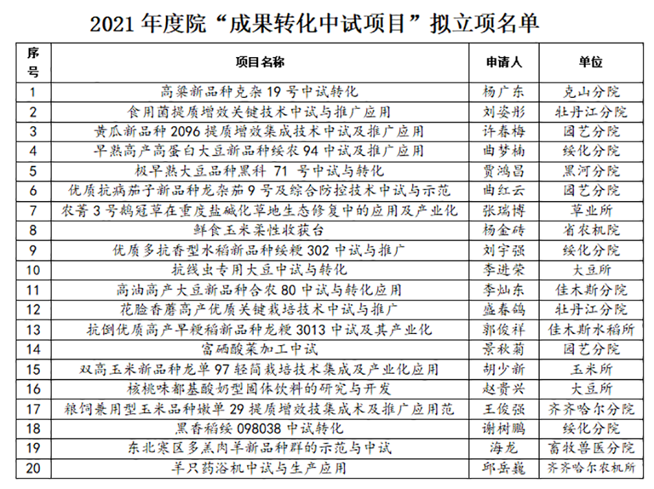 为全面落实乡村振兴战略,逐步建立以市场需求为导向的成果产出机制,引导科研人员面向科技前沿、面向经济主战场、面向国家重大需求展开科技攻关,增强成人网站 科研人员成果转化意识,支持有苗头、有潜力、具备市场应用前景,促推产业发展的科技成果转化应用。拟确立20个项目进行立项支持。现予以公示,并就有关事项说明如下:
