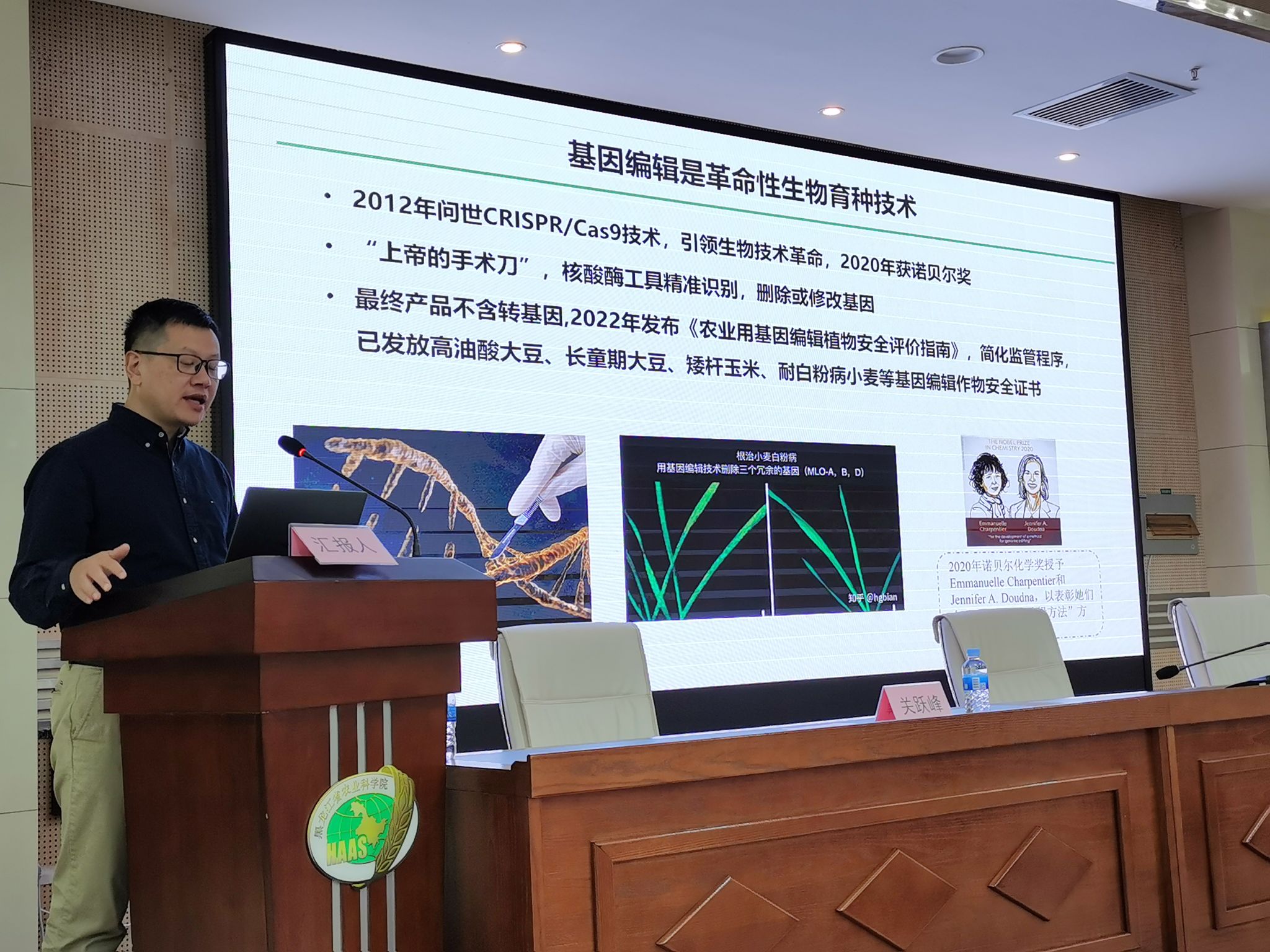 报告后,现场科技人员纷纷提问,对基因编辑技术产生了浓厚的兴趣,与关教授就基因编辑在大豆、水稻、紫花苜蓿等作物应用的难点和国家基金项目申报等进行请教。