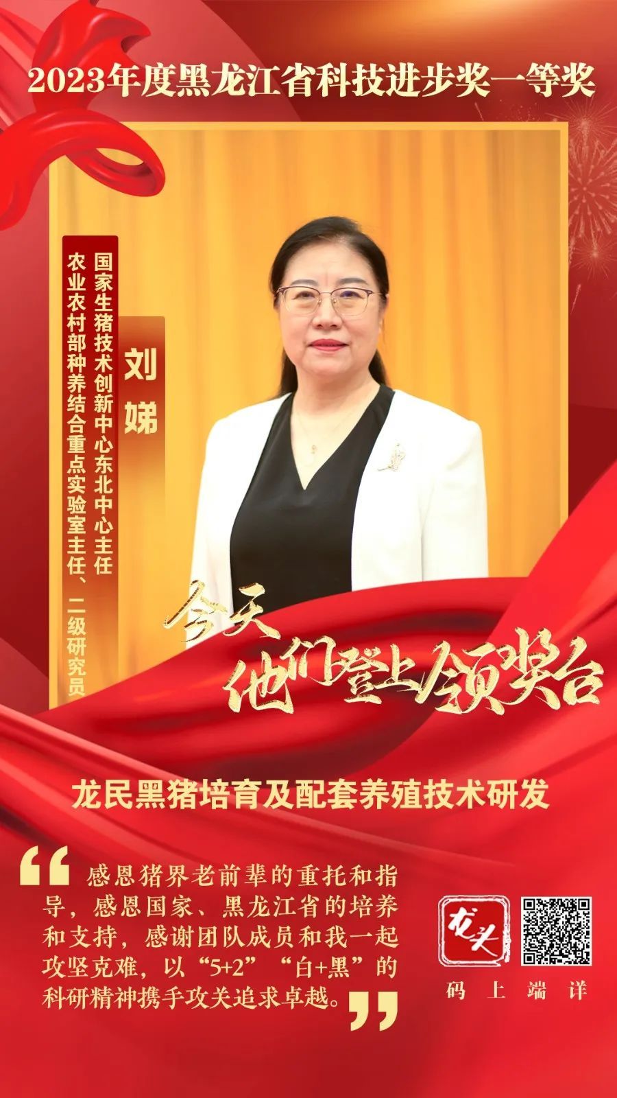 10月9日,全省科技大会、省科学技术奖励大会在哈尔滨隆重举行。国家生猪技术创新中心东北中心主任、农业农村部种养结合重点实验室主任、成人网站 畜牧研究所二级研究员刘娣率领团队凭借“龙民黑猪培育及配套养殖技术研发”项目获得2023年度黑龙江省科技进步奖一等奖,并作为获奖代表光荣登上领奖台。