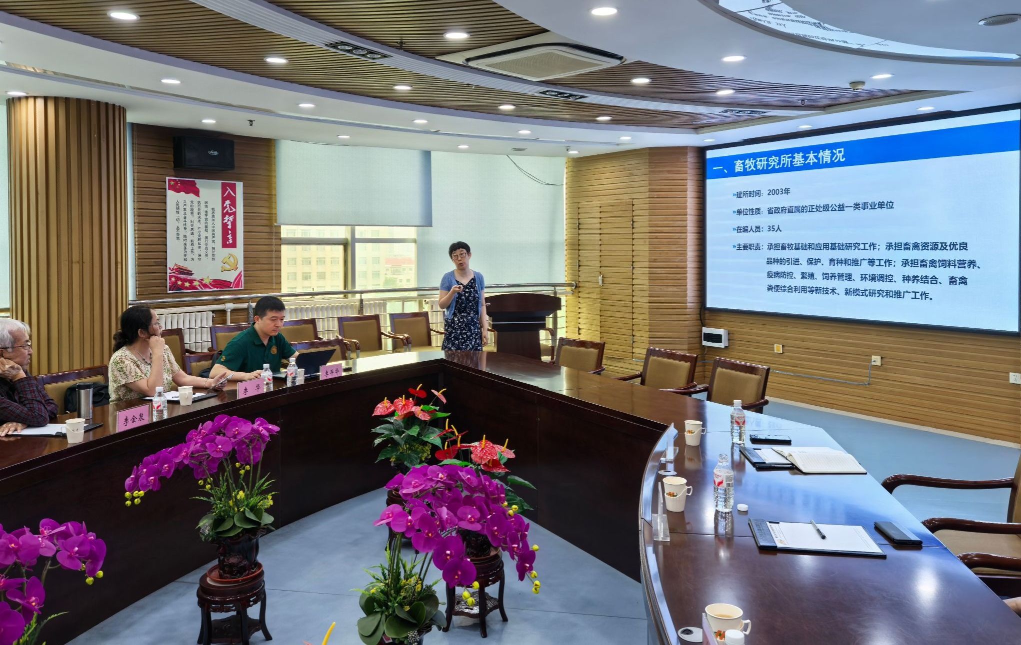 张冬杰副所长介绍了我所科研队伍、基地建设、成果转化等方面的基本情况及优势特色。何鑫淼所长就人员结构、科研立项、成果产出等已有成绩进行了内容补充,以产业倒推科研、推广龙民黑猪配套系为例,介绍了我所成果转化的相关工作。同时也剖析了科研领域的现存的问题,愿在专家及院领导的细致指导与殷切关怀下不断成长。