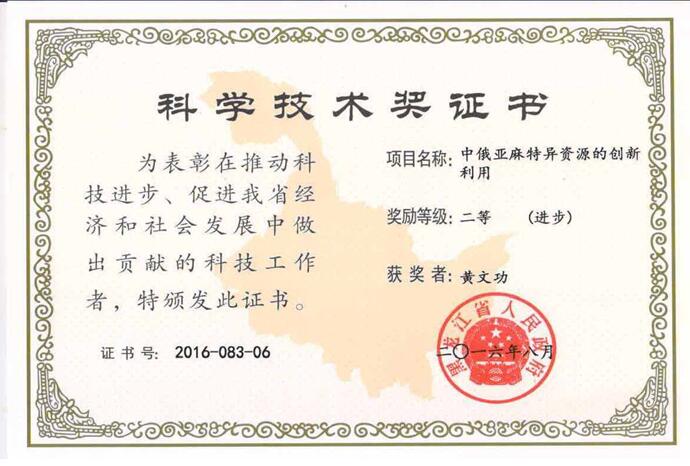 2016年获得黑龙江省政府二等奖1项:中俄亚麻特异资源的创新利用。