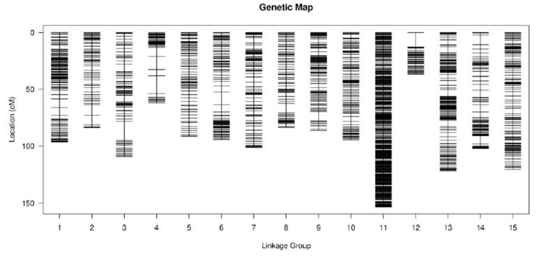 利用DIANE(纤用亚麻栽培种)和宁亚17(油用亚麻栽培种)为杂交亲本,构建了F2作图群体,选用71对SRAP和24对SSR共显性标记构建全长为546.5 cM,含12个连锁群(LGs)的亚麻遗传连锁图谱,每个连锁群有4~15个标记,该图谱中标记间平均距离为5.75 cM。结果表明,该图谱上的标记均匀分布于12个连锁群,说明SRAP标记和SSR标记中共显性标记适合亚麻遗传图谱的构建。为进一步加密遗传图谱,亚麻遗传育种研究室开展了亚麻简化基因组测序,大大提升了标记的上图数量和密度,使亚麻遗传图谱总图距达到1493.83 cM,上图标记达到2497个,该图谱是目前国内首张亚麻高密度遗传连锁图谱。亚麻全基因组遗传连锁图谱为今后的亚麻在分子生物学方面的研究奠定基础。