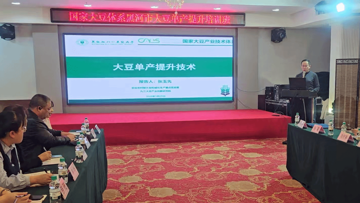 3月25日,国家大豆产业技术体系黑河市大豆单产提升2025年工作推进暨培训会在黑河市顺利举行。黑河市农业农村局副局长苏辉、黑河市农业农村服务中心主任王大纲、国家大豆产业技术体系栽培岗位专家张玉先教授、孙磊研究员、徐彩龙副研究员、早熟育种岗位专家韩英鹏教授、绥化试验站站长景玉良研究员、齐齐哈尔试验站站长袁明研究员、九三试验站站长张安宏研究员、海伦试验站团队成员欣春副研究员、国家玉米产业技术体系黑河试验站站长李金良副研究员及黑河市6个市县区农业技术推广中心负责人、技术骨干和部分企业代表等40余人参会。国家大豆产业技术体系特早熟育种岗位专家鹿文成研究员主持会议,国家大豆产业体系首席科学家吴存祥线上出席会议并作指导讲话。
