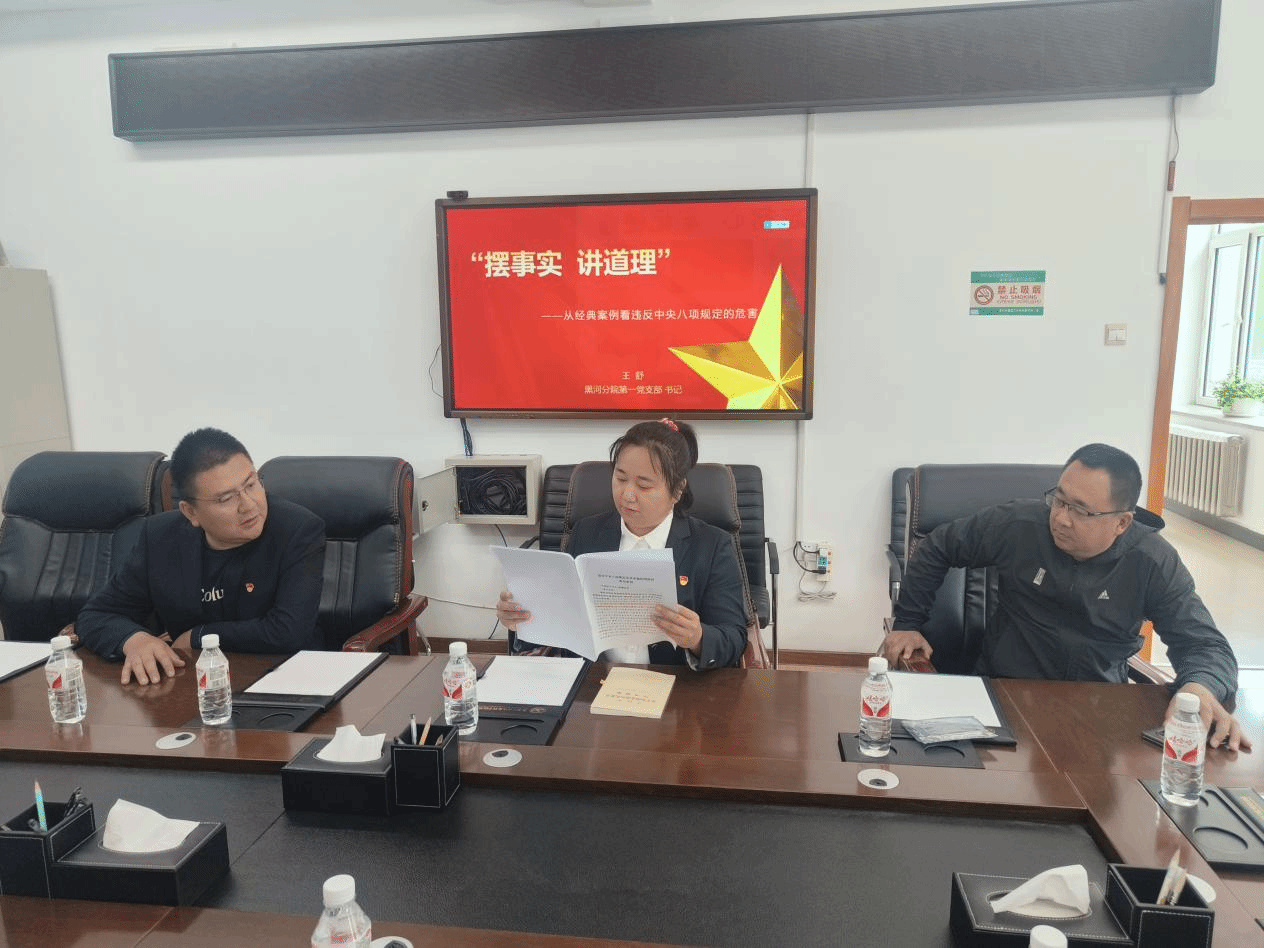 6月3日,党委会第一议题学习习近平总书记在《求是》杂志第10期发表的《锲而不舍落实中央八项规定精神,以优良党风引领社风民风》重要文章精神。召开党委理论中心组学习会议1次,党委委员对《院系统近三年违纪违法典型案例》《黑龙江省违反中央八项规定及其实施细则精神典型案例》《习近平关于加强党的作风建设论述摘编》第五章至第九章等内容进行学习研讨,撰写交流材料。