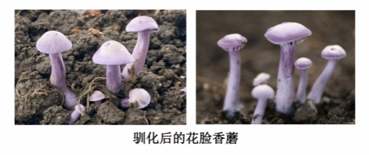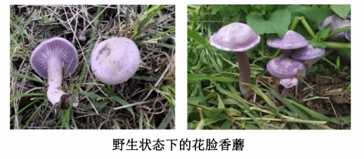 花脸香蘑属于中温类食用菌,适宜生长温度为20~26℃, 自然界中的花脸香蘑于初夏至夏季单生、群生或近丛生于田野路边、草地、农田附近、村庄路旁。新鲜时紫罗兰色,菌盖直径4 cm~8cm,幼时半球形,后平展,幼时中部下凹,湿润时半透明或水浸状。失水后颜色渐淡至黄褐色,边缘内卷,具不明显的条纹,常呈波状或瓣状。菌肉淡紫罗兰色,较薄,水浸状。菌褶直生,有时稍弯生或稍延生。中等密,淡紫色。菌柄长4 cm~6.5cm,直径0.3 cm~1.2cm,紫罗兰色,实心,基部多弯曲。