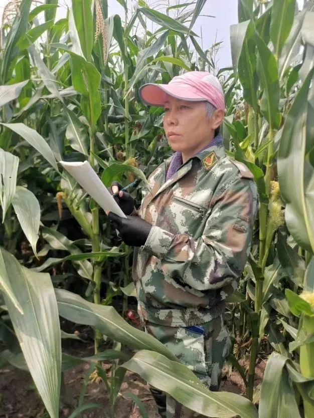 到了夏天,下田时钱春荣穿着迷彩服,顶着骄阳穿梭在玉米地,调查花期、记录性状。炎炎烈日下,一上午四五瓶矿泉水进肚居然一次厕所也不用去,全随汗液蒸发了。从四月到十月,一整个玉米生长季,钱春荣和团队成员几乎无休,许多人的皮肤都被晒脱了皮。