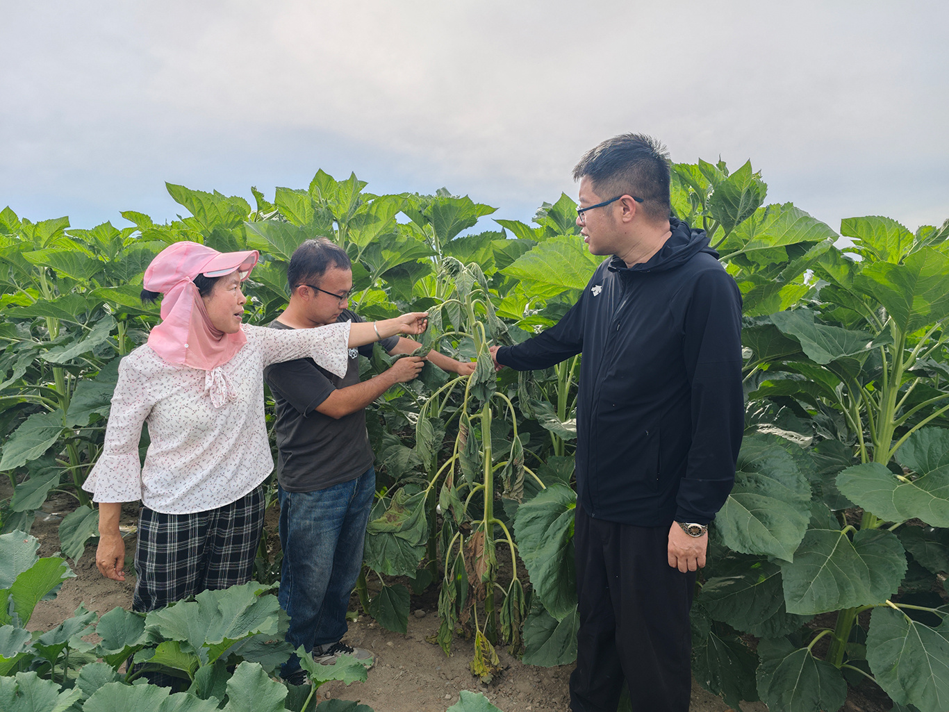 2024年5月,十师一八八团三连的食葵田因除草剂漂移出现药害,他立即赶赴现场,仔细查看受灾情况,指导农户喷施芸苔素内酯,让10%受损植株重焕生机;十师一八八团九连遭遇8级风灾,200亩食葵幼苗受损,刘佳仔细观察受损情况,现场制定“补种+营养液滴灌”方案,使食葵成活率提升至85%。