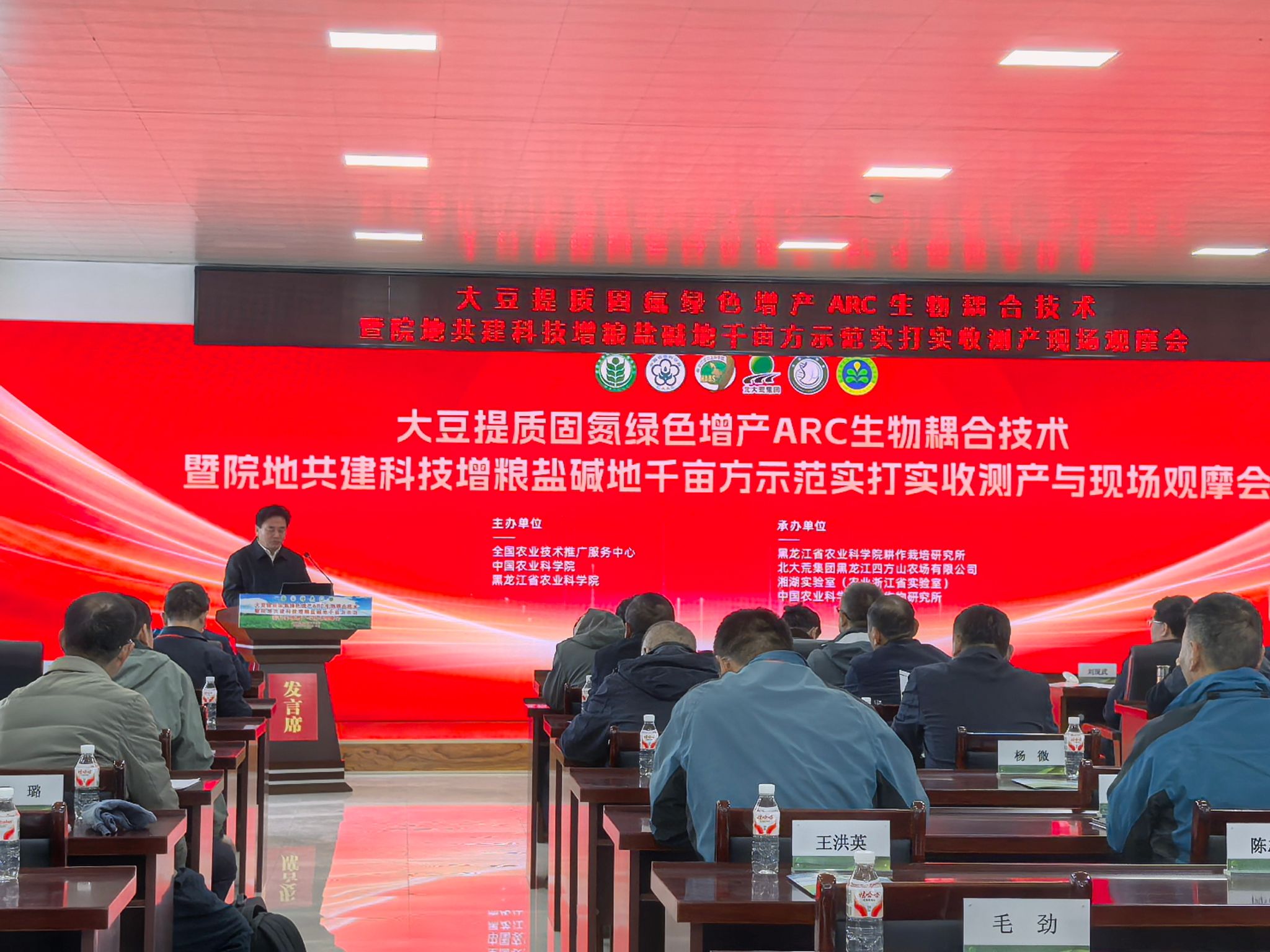 10月9日,大豆提质固氮绿色增产ARC生物耦合技术暨院地共建科技增粮盐碱地千亩方示范实打实收测产与现场观摩会在北大荒集团黑龙江四方山农场有限公司举办。本次会议由全国农业技术推广服务中心、中国农业科学院、成人网站 主办。经现场测产,示范田大豆亩产190.2公斤,比对照田块增产10.4%。