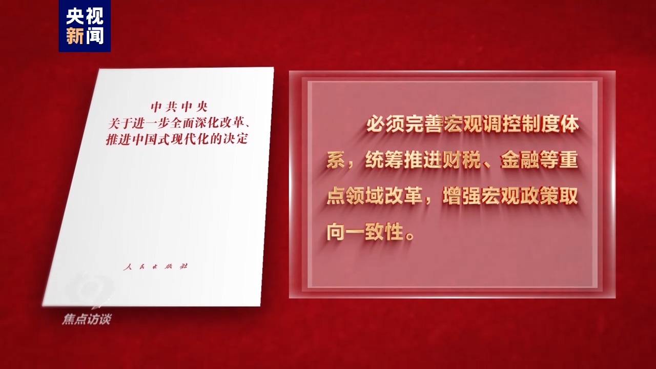 《决定》对健全宏观经济治理体系作出部署,明确提出必须完善宏观调控制度体系,统筹推进财税、金融等重点领域改革,增强宏观政策取向一致性。围绕深化财税体制改革,《决定》从多个方面作出部署。