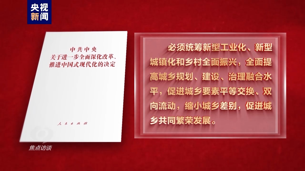 《决定》提出,必须统筹新型工业化、新型城镇化和乡村全面振兴,全面提高城乡规划、建设、治理融合水平,促进城乡要素平等交换、双向流动,缩小城乡差别,促进城乡共同繁荣发展。