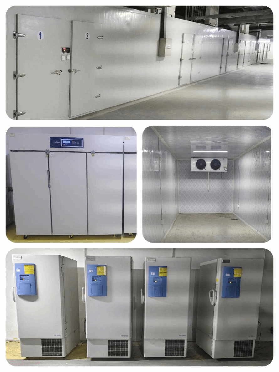 可进行植物种质资源、生物材料、生物制品、化学试剂、菌种、生物样本等低温保存。拥有低温冷库15间,其中温度可控制在-20℃至室温的4间,-10℃至室温的11间,超低温冰箱4台。