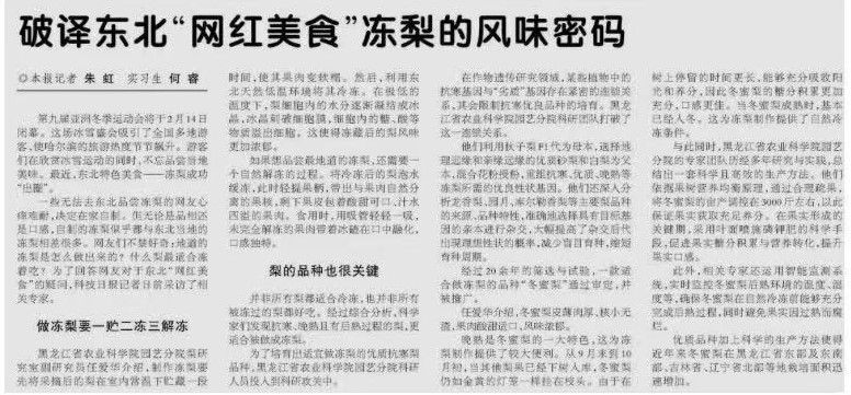 第九届亚洲冬季运动会将于2月14日闭幕。这场冰雪盛会吸引了全国多地游客,使哈尔滨的旅游热度节节飙升。游客们在欣赏冰雪运动的同时,不忘品尝当地美味。最近,东北特色美食——冻梨成功“出圈”。一些无法去东北品尝冻梨的网友心痒难耐,决定在家自制。但无论是品相还是口感,自制的冻梨似乎都与东北当地的冻梨相差很多。网友们不禁好奇:地道的冻梨是怎么做出来的?什么梨最适合冻着吃?为了回答网友对于东北“网红美食”的疑问,...