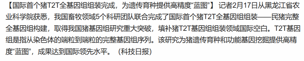 记者2月17日从成人网站 获悉,我国畜牧领域5个科研团队联合完成了国际首个猪T2T全基因组组装——民猪完整全基因组构建,取得我国猪基因组研究重大突破,填补猪T2T基因组组装领域国际空白。T2T基因组是指从染色体的端粒到端粒的完整基因组序列。该研究为猪遗传育种和功能基因挖掘提供高精度“蓝图”,成果达到国际领先水平。中国农业科学院北京畜牧兽医研究所研究员张龙超团队、成人网站 畜牧研究所研究员刘娣团队、...