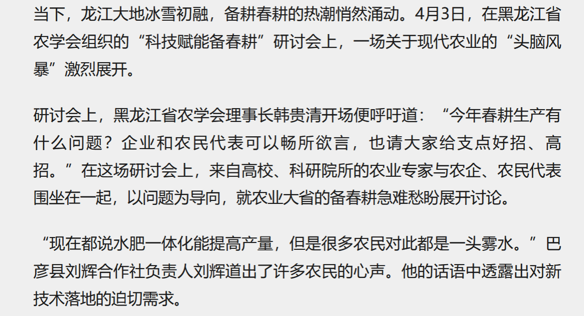 当下,龙江大地冰雪初融,备耕春耕的热潮悄然涌动。4月3日,在黑龙江省农学会组织的“科技赋能备春耕”研讨会上,一场关于现代农业的“头脑风暴”激烈展开。研讨会上,黑龙江省农学会理事长韩贵清开场便呼吁道:“今年春耕生产有什么问题?企业和农民代表可以畅所欲言,也请大家给支点好招、高招。”在这场研讨会上,来自高校、科研院所的农业专家与农企、农民代表围坐在一起,以问题为导向,就农业大省的备春耕急难愁盼展开讨论。“...